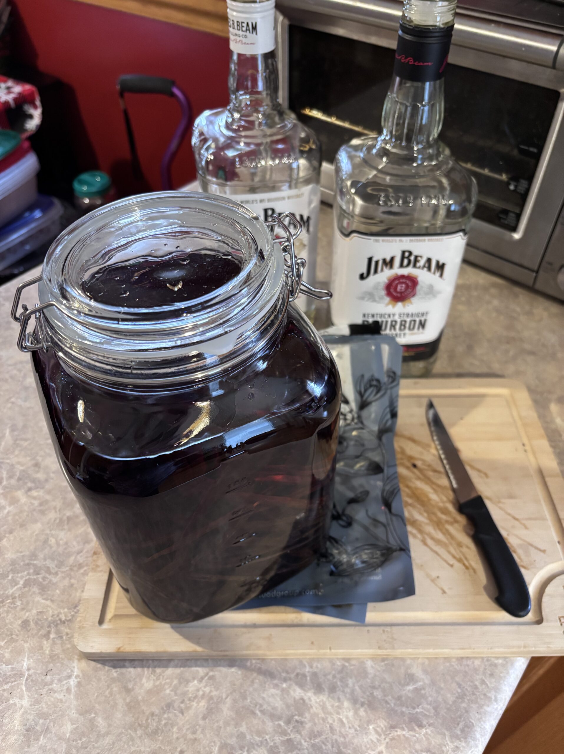 Put them all loosely in the jar. Then add 40% alcohol by volume to fill the jar. You can use pretty much anything: vodka, rum, or bourbon (which is what I used). Don’t buy the most expensive alcohol in the store, no need for that. Seal the jar up tight.